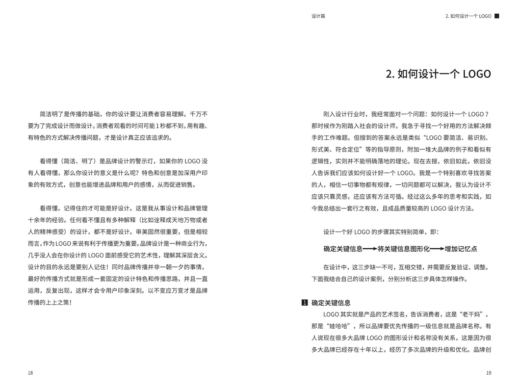 本书分为两大部分:设计与传播。前者主要讲品牌的设计,分别从什么是好设计、怎样设计一个好Logo、品牌怎样从设计到落地等方面介绍设计师如何设计品牌各种视觉物料;后者主要讲品牌的传播,分别从品牌传播三原则、品牌传播中要避免的问题以及品牌创立需要准备的东西等方面入手,介绍品牌传播需要注意的各种问题和宣传销营的技巧等。总体而言,好的设计一定是逻辑先行,辅助传播,落地漂亮的。作者结合自己对当前品牌的设计与营销传播两方面的看法,让本书内容更加实用。