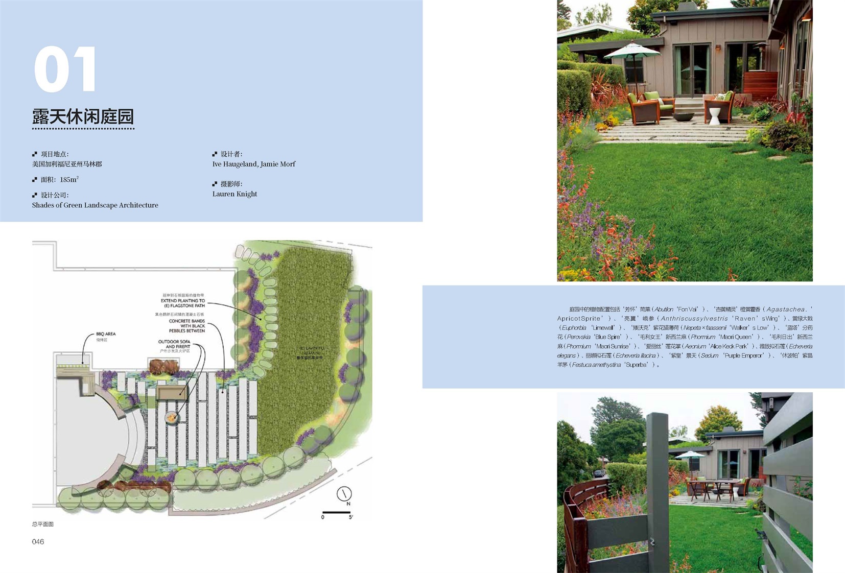 每个案例均配有平面图,有些还有素描图和三维手绘图,已经完成的景观部分,全部用图片来展示庭园全貌,包括一些细部节点,如植物、铺地、水景及雕塑等。