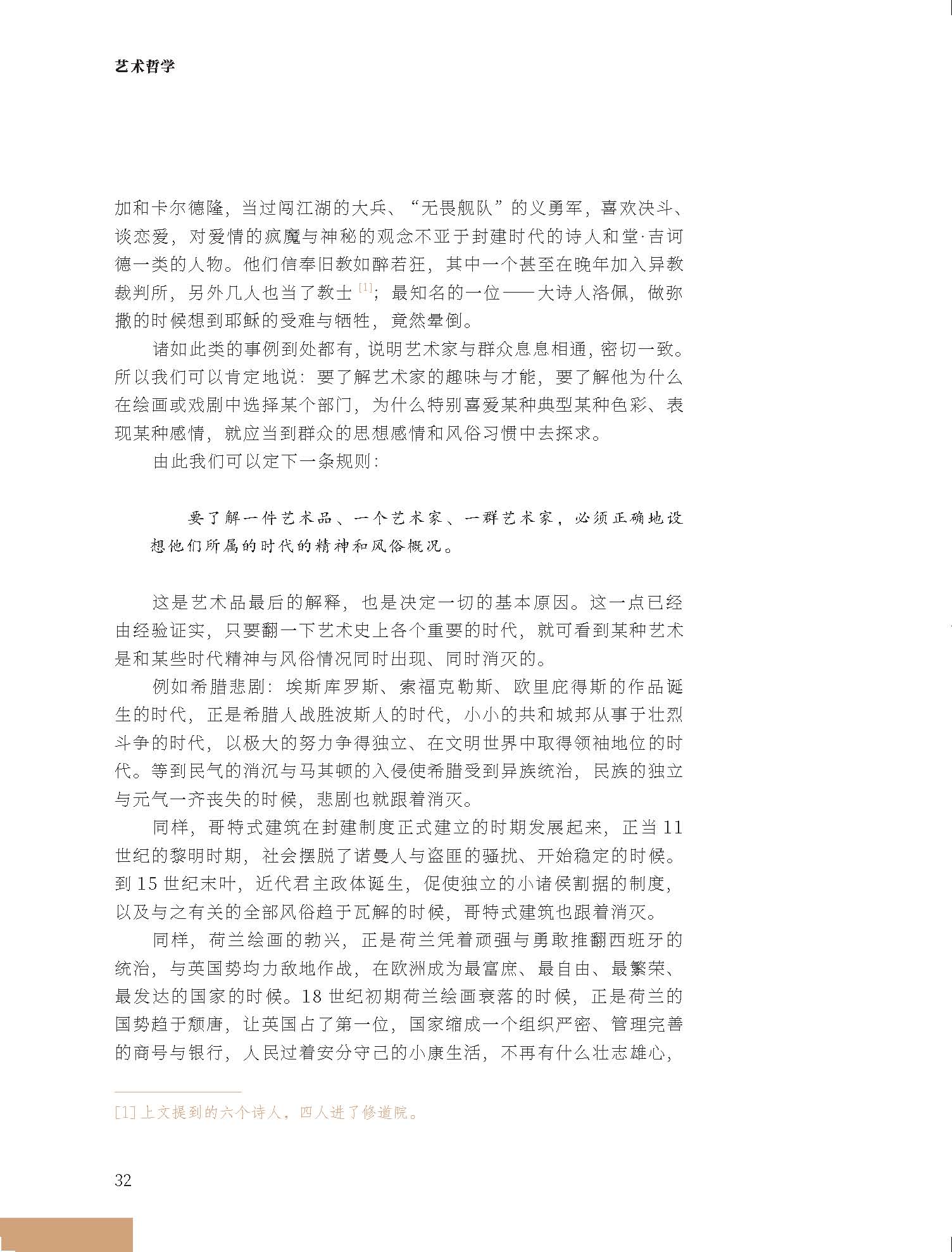 《艺术哲学》辑录了作者丹纳在法国巴黎美术学校讲述美术史的讲义,共分为五部分。第一部分为艺术品的本质及其产生;第二部分为意大利文艺复兴期的绘画,主要介绍了文艺复兴期意大利绘画的特征、主要形势和次要形势等;第三部分为尼德兰的绘画,介绍了其历史时期;第四部分从种族、时代、制度三方面介绍了希腊的雕塑;第五部分为艺术中的理想。本书“采用的不是一般教科书的形式,而是以渊博精深之见解指出艺术发展的主要潮流”,对于我们欣赏欧洲文艺复兴时期的艺术和欧洲哲学起源之一——希腊雕塑,具有非常重要的指导意义。