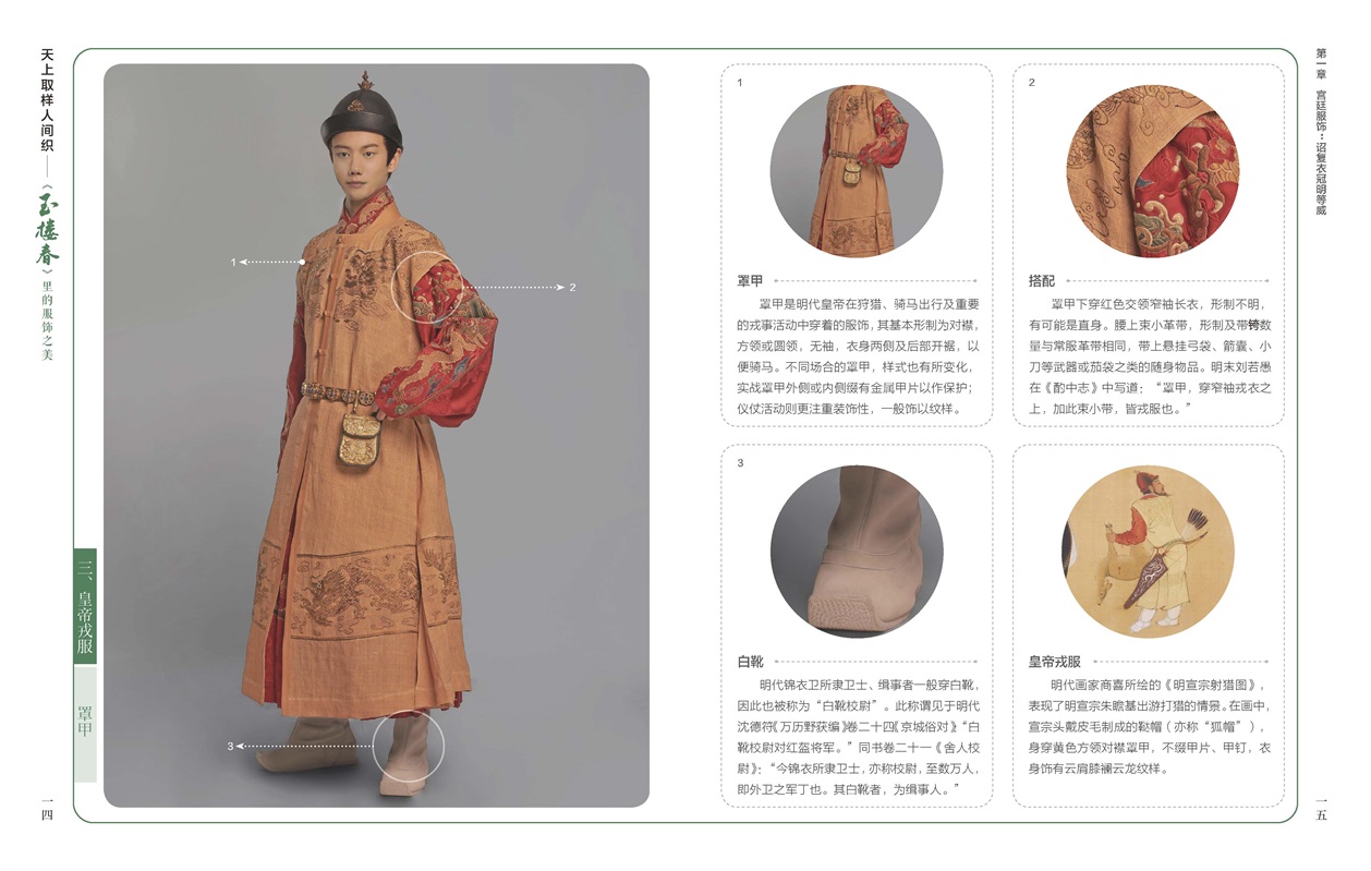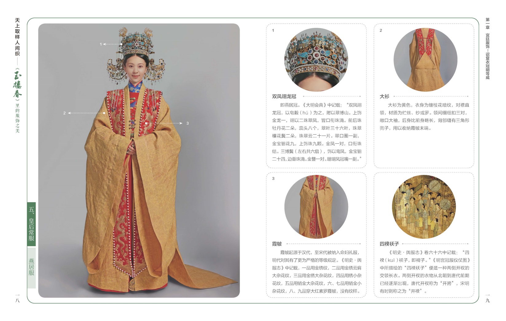 《天上取样人间织——<玉楼春>里的服饰之美》主要以热播影视剧《玉楼春》中的服饰为素材,梳理展示了包括剧中的近70种服装,以及各种不同款式的衣冠、饰品等。书中图片选取的定妆照服饰,包括皇帝常服、皇后礼服、士庶男子服饰、妇女便服、军戎服饰等,配以易读而不失专业的文字,详细解释不同服饰背后蕴含的文化。作者团队用简明易懂的语言,穿插我国古代服饰的基本知识,将多种服饰的特色和典故娓娓道来,同时介绍了刺绣、缂丝等“非遗”传统手艺。书中选取图片精美,文字优美,抒发了作者团队对中国服饰文化的礼赞。