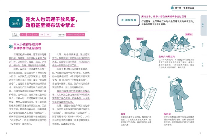该书以日本江户时代为背景,介绍了日本古代人的饮食起居、节日庆典、娱乐方式等。全书共分为五个章节,第一章介绍春季的三个月,内容包括日本古人过年的仪式和习俗、日本古人对时令海产和农产品的喜爱等;第二章来到盛夏的三个月,介绍了日本古人的夏季生活,如何进行衣物换季、男孩节升鲤鱼旗的习俗渊源、江户城内盛大的山王祭等;第三章为秋季,介绍了日本人祭祖的节日盂兰盆节、神田祭的花车游行等;第四章则介绍了日本江户时代人冬季的生活,古时日本的酿酒业分布、迎接新年的准备等。第五章通过五个具有代表性的方面来展现江户文化,分别为日本传统戏曲、江户人的旅行、兴趣爱好、公共设施、娱乐方式。