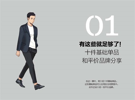本书由日本人气造型师结合问卷调查结果编写,调查并总结出在女性眼中什么样穿搭的男性更有吸引力,什么样的穿搭给人印象不好,自己更关注男友或丈夫衣着的哪些细节等。是一本一看就懂的男士穿搭基础原理图解。全书共分为三章节,第一章介绍了十件每位男士都一定要有的单品,比如黑色西装外套、白色T恤、小白鞋等,告诉男性读者如何更快速的搭配好这十件基础品。第二章分为三个小节,分别为休闲穿搭、工作穿搭、服装配色,内容更加实用。第三章内容为应对各季节特定活动场合的穿搭推荐,比如春季赏花踏青的穿搭推荐、夏季和伴侣出行的穿搭、秋季公司秋招的商务穿搭、冬季春节回家的穿搭等。