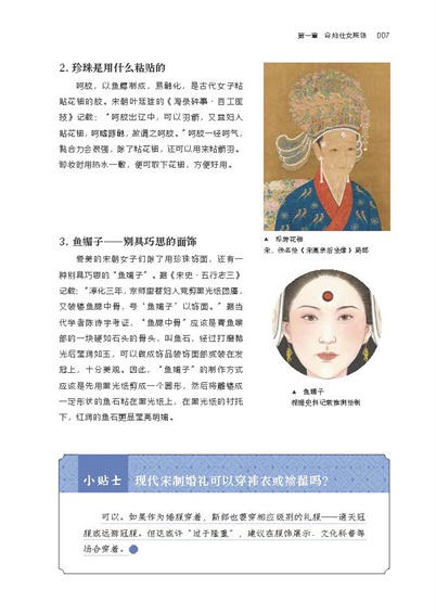 此外,本着“链接古今、古为今用”的初衷,每个场景的结尾,都有一个实用的“穿搭指南小贴士”。怎么固定披帛?怎么搭配鞋子?儿童汉服怎么选?宋制婚服怎么选?希望能为读者穿着汉服时的疑惑提供建议和参考。