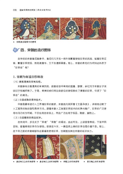 本书以宋代绢本画为主要蓝本,以宋代壁画为辅,搭建了33个场景,大到谒庙朝会、宫宴雅集,小到燕居侍花、耕织斗茶。尝试在特定情境的代入中,阐述命妇仕女、士宦富贾、少年儿童以及庶民百工不同群体的妆束,既涵盖巾帽冠带、衫袍鞋服,又包括发型妆容、纹样配饰。此外,结合汉服在当代生活中的应用需求,搭建了5个虚拟场景。通过古籍文献的考证,呈现宋代冠礼、及笄礼、婚礼的流程以及所穿服饰、所用配饰。