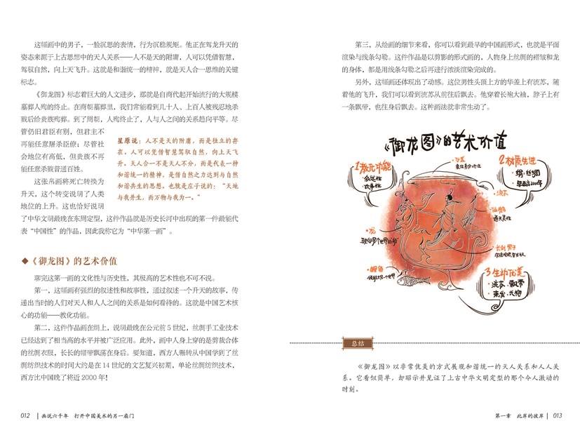 全书共分七章,第一章主要介绍了鹳鱼石斧缸、御龙图等展现古人生死观的器物,探讨中华民族追忆先祖这一文化习俗的历史渊源。第二章细致讲解了敦煌五百强盗成佛因缘图壁画、云冈大佛等佛教艺术在我国古代的发展。第三、四章围绕宫廷艺术品,探讨包括《女史箴图》《韩熙载夜宴图》等体现古代帝王生活样貌的画作。第五章借山水画,介绍作品与画家间的关系,展现了作者的精神面貌与思想。第六章详细介绍了《珊瑚笔架图》《容膝斋图》等艺术作品对新的书画语言的探索与使用,展现了那些表达个性与特定感情的书法作品和文人画接近19世纪起源于欧洲的现代艺术运动的艺术形式,也就是古代的现代。第七章则介绍了以《搜尽奇峰打草稿》《千岩万壑图》为代表的17—19世纪具有独创性的中国艺术作品,它们的出现打破了当时中国艺术上保守陈旧的局面,创造了又一波中国美术创作的高光时刻。