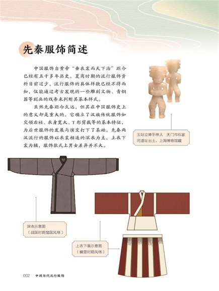 为增强代入感,以大家耳熟能详的屈原、李清照等历史知名人物及所涉及的场景作为引子,从相关的文物、壁画等素材入手,介绍当时的社会环境、工艺技术对服饰的影响,展示、还原出服饰结构示意图及实物样式。每章的后半部分还会提供模特团队穿着以上衣物时的层次示意图,尽可能直观还原出古人实际穿着效果。