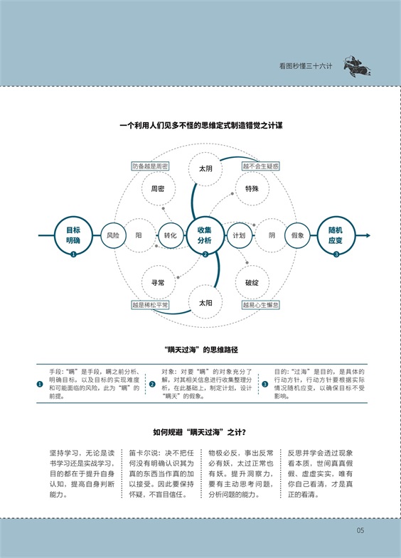 《三十六计》,或称《三十六策》,是一部兵法奇书,语源于南北朝,成书于明清。记载了三十六条兵法计谋。本书是基于《三十六计》原著上,进行视觉语言翻译给读者,辅助读者延长记忆的时间,便于读者去理解。书中每个章节主要包含:原文、译文、启示、总结、思维模型和规避之道这几个部分组成,将艰涩的古代语言简洁化、可视化,易懂、易记、易用。以精简清晰的视觉解读,来提炼核心思想,有助于读者快速入门,从而启迪智慧,提升认知。