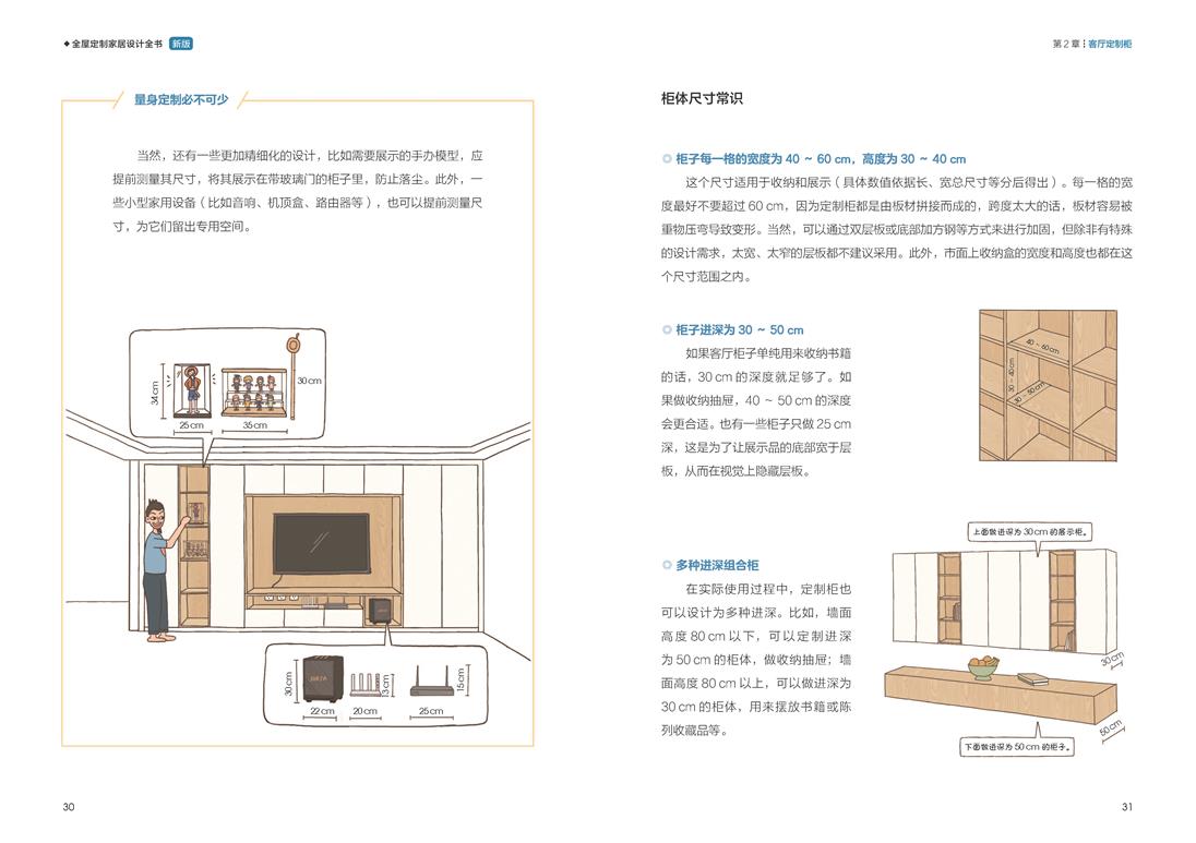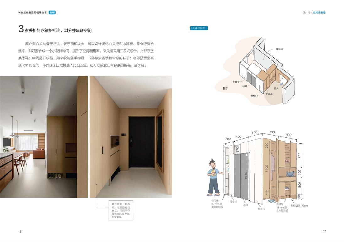 300+手绘插图,轻松活泼,降低理解门槛,玄关、客厅、厨房、餐厅和卧室等空间定制柜设计详解,将定制柜设计与空间属性紧密结合。