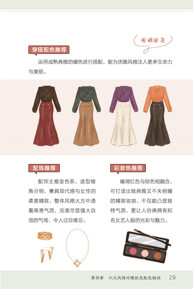 二、色彩全适配,配色不踩雷:结合冷暖肤色与四季型色彩,拆解24种风格季型组合配色,职场、日常、正式场合均有专属方案,黄皮显白、黑皮提亮一站式搞定。
