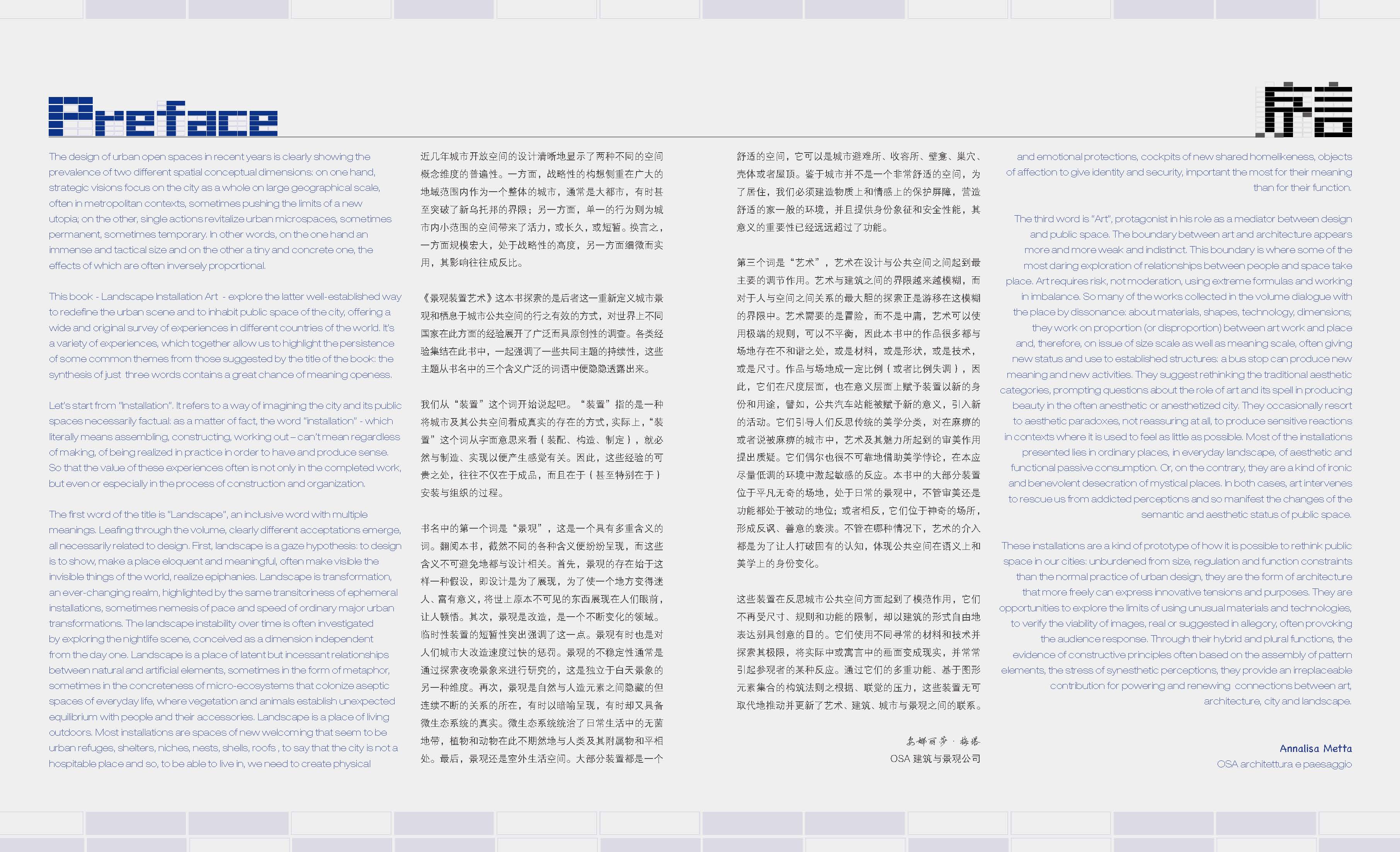 本书通过高精度的图片、详细的文字介绍,展示了世界上最新、最具创意的79个景观装置作品。大量的手绘图及其他细节图纸有助于读者更好地理解设计师的理念及安装过程。书的末尾还以二维码方式附赠了25个作品。