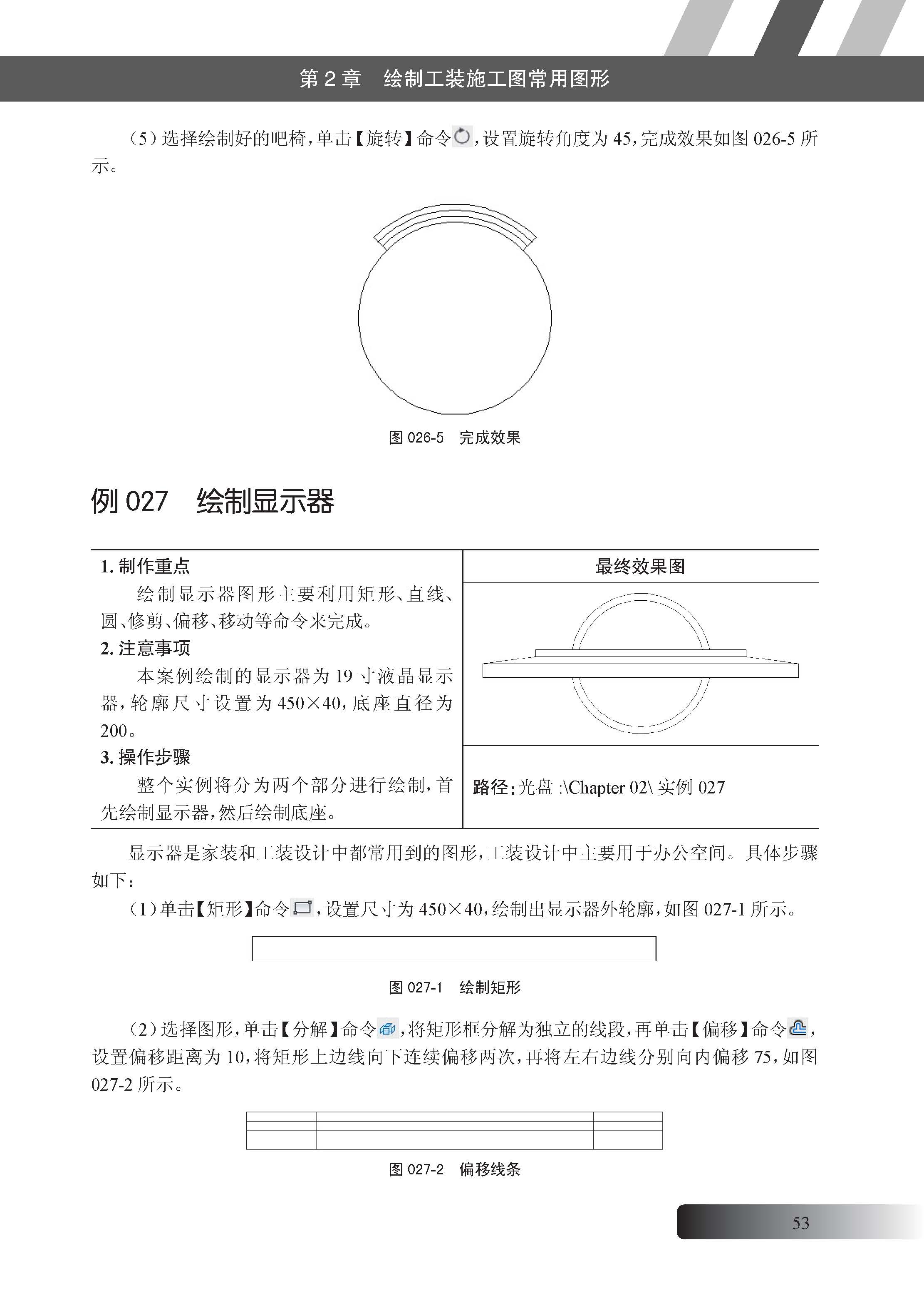 本书以建筑和室内设计制图为主,精心挑选了近200个案例进行讲解。全书共15章,主要内容有:设计家装施工图常用图形、绘制工装施工图常用图形、设计施工图常用材料图形、设计园林施工图常用图形、设计现代风格小户型图、设计简欧风格两居室图、设计现代风格三居室图、设计错层户型图、设计中式别墅图、办公空间设计方案、酒店客房设计、KTV包厢设计、餐厅设计、服装专卖店设计、绘制家具三维模型等。